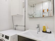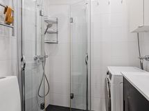 - Pesutilojen kuvaus: Sadevesisuihku, taittuvat suihkuseinät, peili, allaskaappi, kylpyhuonekaapisto, pyyhekuivain ja pesukoneliitäntä. Lattia ja seinät laattaa.