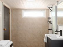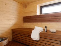- Kuvaus: Lattia laatoitettu, seinät ja katto paneloitu, ikkuna. sähkökiuas