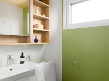 - Pesutilojen kuvaus: Alakerran saunaosaston kylpyhuone: seinät ja lattia laatoitettu, katto paneloitu, ikkuna. Varusteet: suihku, suihkuseinä, wc-istuin, allaskaappi, Temal-kaappi, suihkuhyllyt, peili, bideesuihku, pesukoneliitäntä (tilaa pesutornille). Erillisen WC:n kuvaus: Varusteet: wc-istuin, allaskaappi, peili, peilikaappi, bideesuihku. Ikkuna.