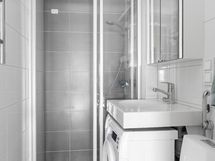 - Suihku, suihkuseinä, peilikaappi, pesukoneliitäntä, pyykinpesukone, kiinteät valaisimet, käsisuihku.