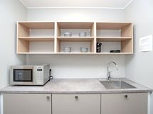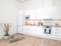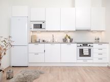 - Keittiön varusteet: Jääkaappipakastin, uuni, liesi, liesituuletin, mikroaaltouuni ja astianpesukone. Liesi: Induktioliesi. Työtason materiaali: Laminaatti.