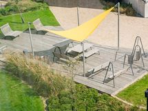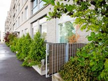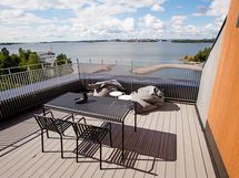 - Terassilta kulku rantakadulle erillisen portiin kautta. Terassi laudoitettu, näköesteenä kaunista istutettua kasvillisuutta ja aitaa.