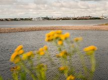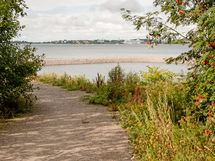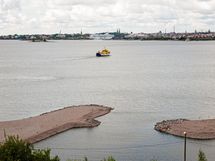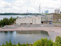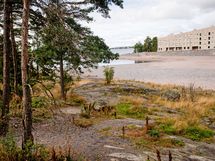 - Saaristolaivastonkadun yli merelle, uimarantaan joita suojaavat aallonmurtajat sekä pitkälle Helsingin siluettiin.