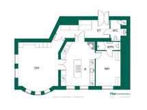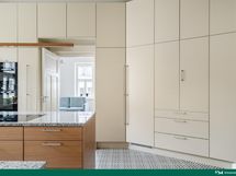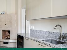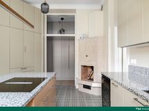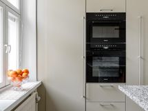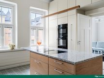 - Kalustepeitteiset jääkaappi, pakastin ja astianpesukone, kalusteisiin sijoitettu uuni ja mikroaaltouuni. Kiinteä saareke, jossa induktioliesitaso ja tasoliesituuletin. Viinikaappi ja aamiaiskaappi, jossa runsaasti pistorasioita eri toiminnoille. Lisäksi TV-varaus. Tasot ml. aamiaiskaapissa Tulikiven Bianco Sardo 30mm graniittia. Kiinteät valaisimet ja saarekkeen yllä Tunto desing led 40 riippuvalaisin Tammi Natural. Mielen kodinkoneet, Stalan allas