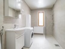 - Pesutilojen varusteet: WC-istuin, suihku, suihkuseinä (kääntyvä), pesukoneliitäntä, peilikaappi (valolla), pesuallas, bidee-suihku, allaskaappi, pesukone (kuuluu kauppaan, jos ostaja haluaa) ja pyykkikaappi ja kapea seinäkaappi. Pesutilojen kuvaus: Remontoitu LVIS-saneerauksen yhteydessä ja valmistunut syksyllä -25. Tilavaan kylpyhuoneeseen mahtuu myös kodinhoitotilaa.
