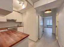- Astianpesukone, jääkaappi-pakastin, keraaminen liesi, liesituuletin, pyykinpesukone. Pintamateriaalit/ lattia: Laminaatti. Pintamateriaalit/ seinä: Maalattu. Materiaalit/ työtasot: Puu. Keittiötilat: Keittokomero