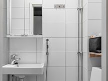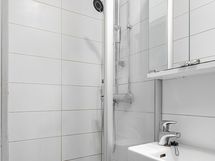 Pesutilojen varusteet: WC-istuin, suihkuseinä, lattialämmitys, peilikaappi, pesuallas ja bidee-suihku.