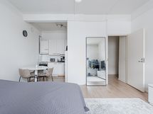 Tehokkaassa pohjaratkaisussa on hyödynnetty jokainen neliö ja tähän kotiin saat helposti mahdutettua kaiken tarpeellisen. Lisäksi tavanomaista korkeampi huonekorkeus tekee asunnosta avaramman tuntuisen. Saat halutessasi keittiön viereen pienen ruokapöydän ja oleskelutila on niin ikään helppo sisustaa erilaisin kalustein, sillä tilaan mahtuu helposti pöytä ja sänky. Asunnonosta on näkymät tunnelmalliselle telakalle ja merelle.