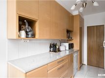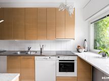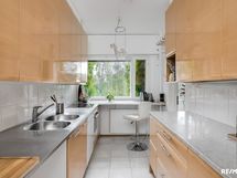 - Työtason materiaali: Kivi. Käytävämallinen keittiö, jonka läpi pääsee kulkemaan aulasta ruokailutilaan. Keittiön eteläikkunaa kehystää kaunis villiviini, ikkunan edessä on pöytä ja työtaso. Keittiön varustus: Osittain kauniit alkuperäiset tammioviset kaapistot, jääkaappi, erillinen pakastin, liesi (integroitu), uuni (erillis), liesituuletin (suodatin). Välitila laattaa.