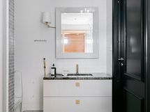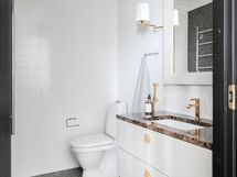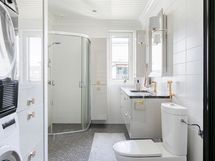 Bidee, suihku, suihkukaappi, pesukoneliitäntä ja lattialämmitys.