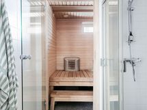 - Kuvaus: Ikkunallinen sauna ja lauteisiin integroitu kiuas. sähkökiuas