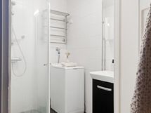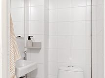 - Kylpyhuone: suihku, kääntyvät suihkuseinät, allas, allaskaappi, peilikaappi, pesukoneliitäntä, pyyhekuivain, kiinteät valaisimet. Erillinen wd: käsisuihku, pesuallas, peili, kiinteät valaisimet. Uusittu yhtiön linjasaneerauksen yhteydessä.