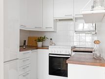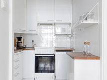 - Jääkaappi/pakastin, astianpesukone, mikroaaltouuni, kaasuliesi- ja uuni, liesituuletin/ aktiivihiilisuodatin, kaapistot, kiinteät valaisimet, työtasot puuta.