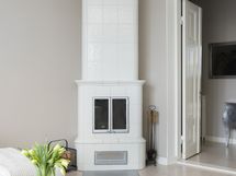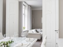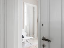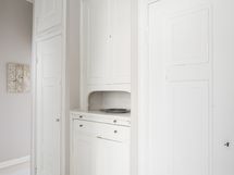 Dekton -materiaali ja malli on Lunar. Leveät lankkulautalattia, seinät maalattu. Keittiössä on tilaa jopa