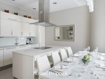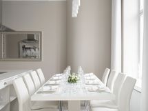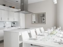 8-10 hengen ruokapöydälle ja tila avautuu suurten pariovien kautta olohuoneeseen luoden yhteneväisen, valoisan ja kauniin kokonaisuuden.