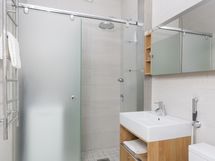 - Pesutilojen kuvaus: Kylpyhuone on remontoitu 2010. Suihku, suihkuseinä/suihkukaappi, peilikaappi, pesuallas, allaskaappi, pesukoneliitäntä, lattialämmitys