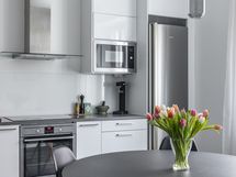 Jääkaappi/pakastin, integroitu liesi, erillisuuni, liesituuletin, astianpesukone, pyykinpesukone, kiinteät valaisimet.