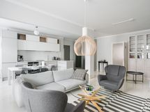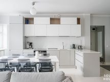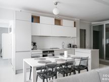 - Valkoinen moderni avokeittiö., missä reilusti kaapistoa. Kalusteuuni / mikro (rst), induktioliesitaso, liesituuletin (aktiivihiili), jääkaappi pakastin yhdistelmä (integroitu), astianpesukone (integroitu), keittiöallas sekä keittiötasot.