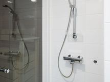 - Pesutilojen kuvaus: Valkoiseksi laatoitettu moderni kylpyhuone. Suihku, seinä wc, käsisuihku, käsienpesuallas / allastaso, allaskaappi ja laatikosto, peilikaappi, kuivauspatteri, lattialämmitys sekä pk-liitäntä.
