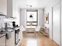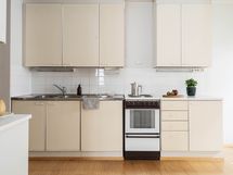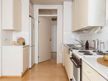 - Liesi: sähköliesi. Työtasot: laminaatti, metalli. Kylmäsäilytys: jääkaappi/pakastin. Välitilassa valkoinen kaakeli.