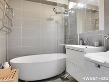 Varustus: ovaali kylpyamme, sadesuihku, allaskaappi / allas, peilikaappi, suihkuseinä (lasi), wc-istuin, pesukoneliitäntä, kuivauspatteri.