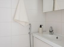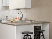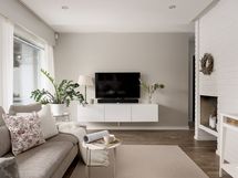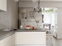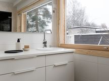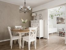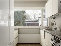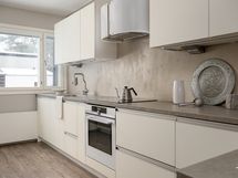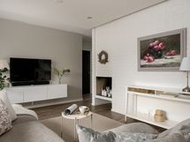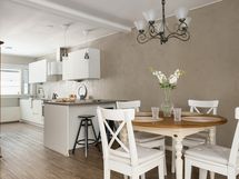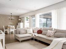 Olohuone on avara ja valoisa, ja suuret ikkunat tuovat tilaan runsaasti luonnonvaloa. Sisustuksessa yhdistyvät pehmeät sävyt ja ajattomat materiaalit, jotka luovat harmonisen pohjan monenlaisille sisustusratkaisuille. Keittiö on uudistettu tyylikkäästi ja käytännöllisesti: säilytys- ja laskutilaa on reilusti, ja kokonaisuus palvelee arkea sujuvasti niin ruoanlaitossa kuin yhdessäolossa.