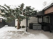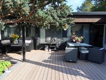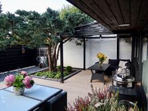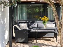 Erityisenä helmenä toimii kodin atriumpiha, joka on laitettu ja suunniteltu upeasti puutarhasuunnittelijan toimesta. Suojaisa ja viihtyisä ulkotila tarjoaa kesäisin täydellisen paikan oleskeluun, ruokailuun ja yhdessäoloon. Terassi ja piha muodostavat kuin toisen olohuoneen lämpiminä kuukausina. Täällä viihdytään aamukahvista iltahämärään.