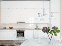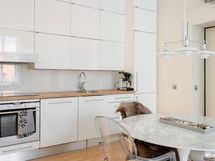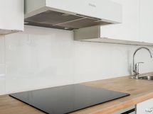 - Keittiön varusteet: Liesituuletin, jääkaappipakastin, astianpesukone, erillisuuni ja kiinteät valaisimet. Liesi: integroitu. Työtason materiaali: Puu.