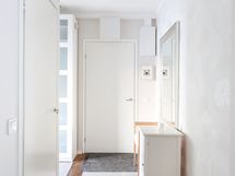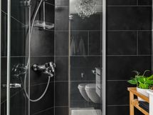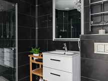 - Kylpyhuone, suihku, taittuvat suihkuseinät, valaistu peili, pesuallas, allaslaatikosto, seinäkiinnitteinen wc, bidée-suihku, pyyhekuivain (vesikiertoinen), kiinteä valaistus, vesikiertoinen lattialämmitys. Lattia: Laatta. Seinät: Laatta