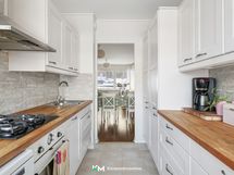 - Kaapistot, aamiaistaso, integroitu jääkaappi/pakastin, kaasuliesitaso, sähköuuni, liesituuletin suodattimella, integroitu astianpesukone, pyykinpesukone, kiinteä valaistus. Lattia: Laatta. Seinät: Maalattu, välitilalaatoitus