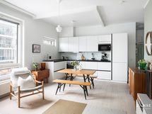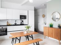 - Keittiössä on liesituuletin, mikroaaltouuni, jääkaappi/pakastin-yhdistelmä, astianpesukone, erillisuuni ja iduktioliestitaso. Keittiössä on integroidut kodinkoneet.