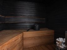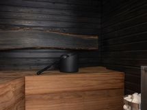 - Saunassa on sähkökiuas. Lauteet ja selkänoja ovat timpurin tekemät. Selkänojan takana on väriä vaihtava valaistus.