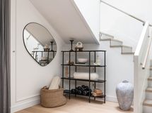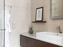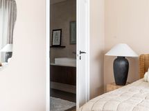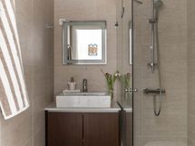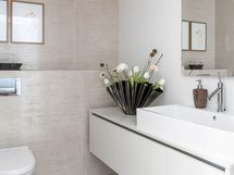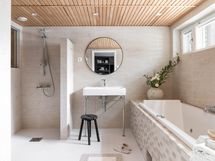 - Pesutilojen kuvaus: Ikkunallinen, tilava kylpyhuone saunan yhteydessä alakerrassa. Varusteena kaksi suihkua, poreallas ja käsienpesuallas. Lattia ja kiukaan tausta Basebeton.