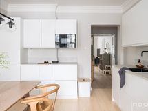 - Keittiön varusteet: Jääkaappipakastin, erillisuuni, liesi, liesituuletin, mikroaaltouuni, astianpesukone ja integroituna pyykinpesukone. Liesi: Keraaminen liesi. Työtason materiaali: Laminaatti. Tilava ja moderni erillinen keittiö, johon mahtuu suuri ruokapöytä. Keittiö on uusittu kokonaisuudessaan edellisen omistajan toimesta, vuonna 2020 (kodinkoneet, (integroituna pyykinpesukone) sähköt, lattia, kaapistot ja tasot), ja se tarjoaa runsaasti laskutilaa sekä säilytystilaa. Suuret ikkunat tuovat tilaan valoa. Keittiö avautuu eteisestä.