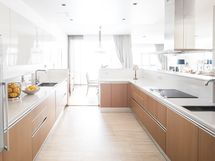 - Tilava ja tasokkaasti varusteltu avokeittiö, josta aukeaa tyylikäs näkymä ruokailutilaan ja olohuoneeseen. Suora merinäköala. Paljon työskentely- ja kaappitilaa. Ruokailutilaan mahtuu iso ruokapöytä. Kaksi erillistä tiskiallasta, kivitasot, ja runsaasti valaistusta eri kohdissa. Astianpesukone, keraaminen liesi, uuni, mikroaaltouuni sekä kaksi isokokoista jääkaappi-pakastinta -- kaikki Gaggenau ja integroitu kalusteisiin. Tilaa isolle ruokapöydälle, Suuri tiskipöytä, Halogeenivalot, Paljon työskentelytilaa, Paljon kaappitilaa, Kivitasot, Astianpesukone, Integroidut koneet, Liesi tai uuni erikseen, Keraaminen liesi, Liesituuletin, Liesikupu, Liesisaareke, Jää-pakastinkaappi