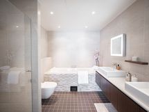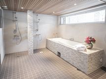 - Asunnossa on kolme erillistä kylpyhuonetta, joista kahdessa on WC-istuin. Lisäksi kaksi erillistä WC-tilaa. Kahdessa kylpyhuoneessa kylpyamme. Saunan yhteydessä olevan spa-osaston ammeessa poreet. Kaikissa kylpyhuoneissa laadukas seinälaatta. Suihku, Suihkukaappi, Useita suihkuja, Kylpyamme, Poreamme, Pesukonevalmius, Laattalattia, Halogeenivalot, Laattaseinä, Rättipatteri, Allaskaappi, Peilikaappi, Lattialämmitys, Erillinen WC