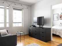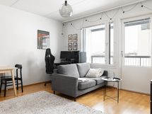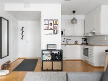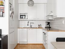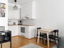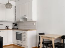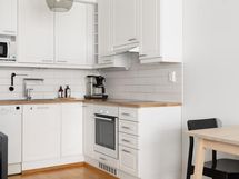 - Jääkaappi/pakastin, keraaminen liesitaso, erillisuuni, liesituuletin, astianpesukone, kiinteät valaisimet. Lattia: Parketti. Seinät: Maalattu, välitilassa laatta
