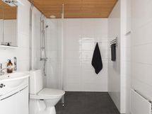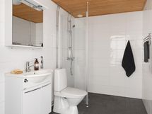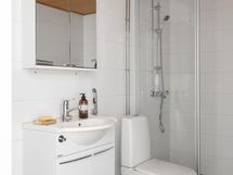 - Suihku, suihkuseinä, peilikaappi, kiinteät valaisimet, kylpyhuonekaapisto, pesukoneliitäntä, kylpyhuoneessa sähköinen lattialämmitys. Lattia: Laatta. Seinät: Laatta