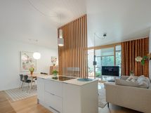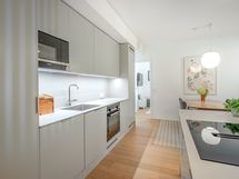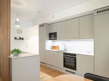 - Osittainen avokeittiö. Siemensin kodinkoneet: Täyskorkeat integroidut jääkaappi ja pakastin, induktioliesi ja liesituuletin, kalusteuuni, astianpesukone, mikroaaltouuni. Roska-astioiden lajittelu. Työtasot laminaattia. Saareke.