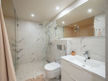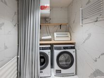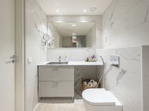 - Pesutilojen kuvaus: Saunan yhteydessä kylpyhuone. Villeroy & Boch laatat. Sadesuihku ja käsisuihku, suihkuseinäke. Pesuallas, allaslaatikosto, 2 laatikkoa. Iso peili. Seinämallinen wc-istuin, Geberit huuhtelupainike, bideesuihku. Huoneistokohtaisella sähköllä toimiva mukavuuslattialämmitys.