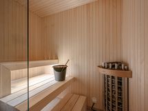 - Paneloitu sauna, lasiseinä kylpyhuoneeseen. Harvian sähkökiuas.