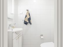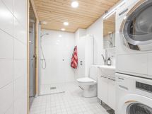 - Pesutilojen kuvaus: Tilava kylpyhuone, joka toimii myös kodinhoitohuoneena. Varustus: suihkuseinä, pesukoneliitäntä, wc-istuin, suihku, peilikaappi, kylpyhuonekaapisto, asennettuja erikoisvarusteita. Erillisen WC:n kuvaus: peili, allaskaappi. Varustus: bidee-suihku.