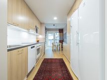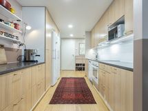 - Liesi: induktio, erillisuuni. Työtasot: laminaatti. Kylmäsäilytys: jääkaappi, pakastin. Varustus: liesituuletin, astianpesukone, kiinteät valaisimet. Moderni keittiö kahdella seinustalla. Hyvin kaappi- ja työskentelytilaa.