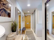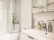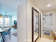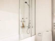 - Pesutilojen varusteet: WC-istuin, kylpyamme, suihkuseinä, rättipatteri, peilikaappi, pesuallas, allaskaappi, bidee-suihku, lattialämmitys, pesukoneliitäntä ja suihku.