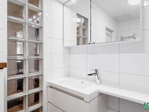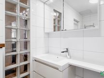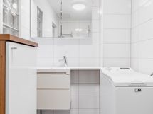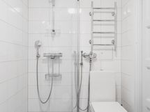 - Suihku/taittuva suihkuseinä, käsisuihku, peilikaappi, allaskaapisto, kylpyhuonekaappi, pesukoneliitäntä, vesikiertoinen pyyhepatteri, sähköinen lattialämmitys, kiinteät valaisimet. . Lattia: Laatta. Seinät: Kaakeloitu
