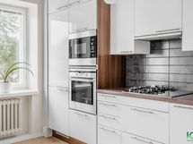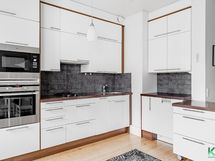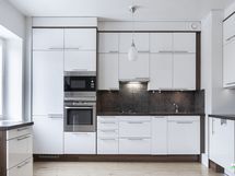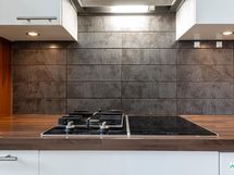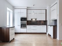 - Puustellin kaapistot ja integroidut/rosteriset kodinkoneet: astianpesukone (AEG), kaasu- ja keraaminen liesitasoyhdistelmä (Siemens), erillinen kiertoilmauuni (AEG), mikroaaltouuni (AEG), jääkaappi/pakastin. Liikuteltava saareke. Lattia: Lauta ( mäntylauta ). Seinät: Maalattu