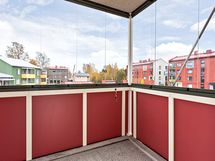 Erillinen keittiö tarjoaa hyvin työ- ja säilytystilaa sekä paikan ruokapöydälle. Keittiö avautuu olohuoneeseen ja luo kodikkaan kokonaisuuden. Olohuoneesta on käynti lasitetulle parvekkeelle, joka tuo lisätilaa oleskeluun. Lisäksi keittiössä on ranskalainen parveke.