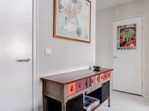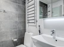 - Pesutilojen varusteet: WC-istuin, suihku, suihkuseinä, pesukone, lattialämmitys, peilikaappi, pesuallas ja allaskaappi.