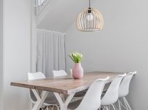 - kylpyhuoneiden katossa ja saunassa materiaalina lämpökäsitelty haapa, kiuas integroitu lauteeseen ja etäohjattava. Lattiamateriaali: laattalattia