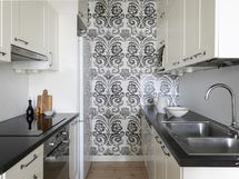 - Kaapistot, allas, hana, jääkaappipakastin, astianpesukone, keraaminen liesi, uuni, liesituuletin. Työtaso laminaattia. Seinät maalattu/tapetoitu. Lankkulattia.